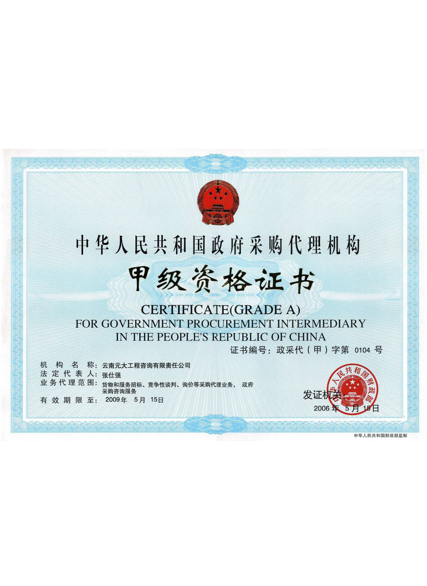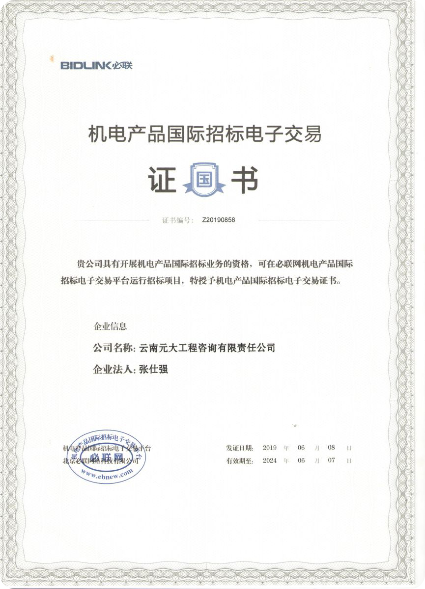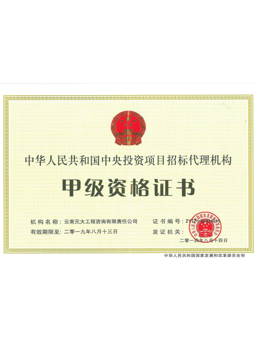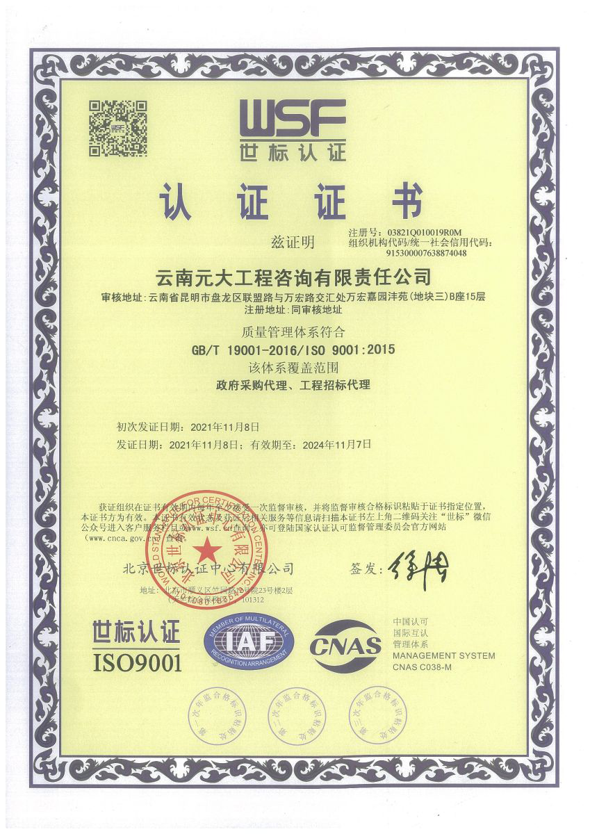 公司是云南省招標投標行業協會會長單位,現為云南省住建廳信用評級招標代理機構AAA級單位。公司先后榮獲住建部頒發的“工程招標代理機構甲級資質證書”、財政部頒發的“政府采購代理機構甲級資格證書”,并在財政部及中國政府采購網“政府采購代理機構名單”登記備案、獲得國家發展改革委頒發的“中央投資項目招標代理機構甲級資格證書”、商務部頒發的“國際招標機構預乙級資格證書”、機電產品國際招標電子交易平臺頒發的“機電產品國際招標電子交易證書”、國家國防科技工業局頒發的“軍工涉密業務咨詢服務安全保密條件備案證書”。公司已通過ISO9001:2015質量管理體系認證、ISO14001:2015環境管理體系認證、ISO45001:2018職業健康安全管理體系認證。納稅信用評價已連續三年被評為A級......
